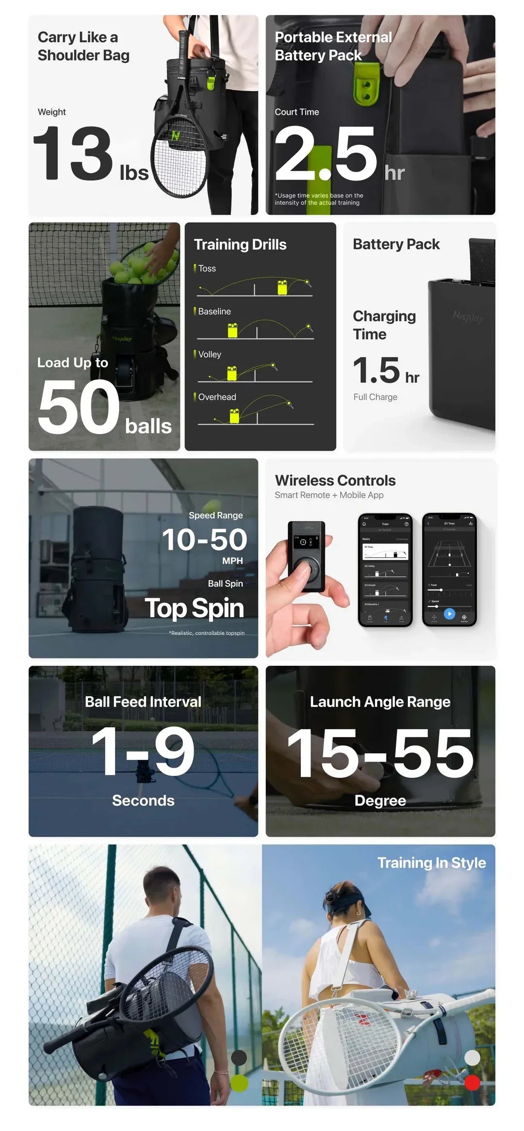 Welcome to the next level of tennis training. Designed for players who demand excellence, our advanced tennis ball machine combines professional-grade performance with remarkable portability. Whether you're honing your first serve or mastering complex rally patterns, it's the dedicated partner you need to outplay the competition.