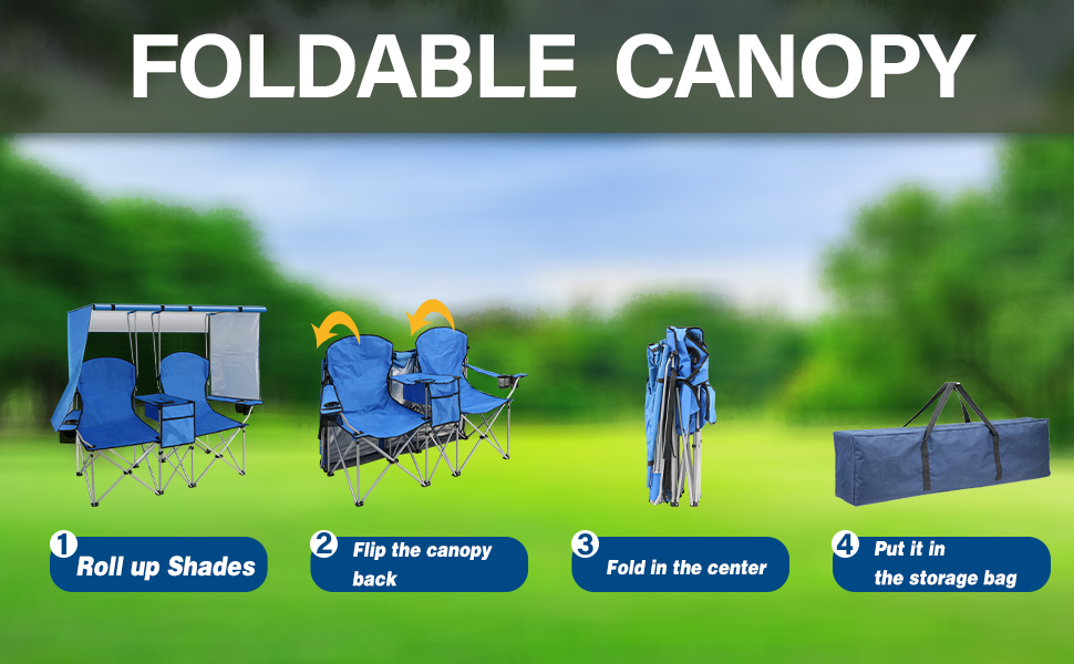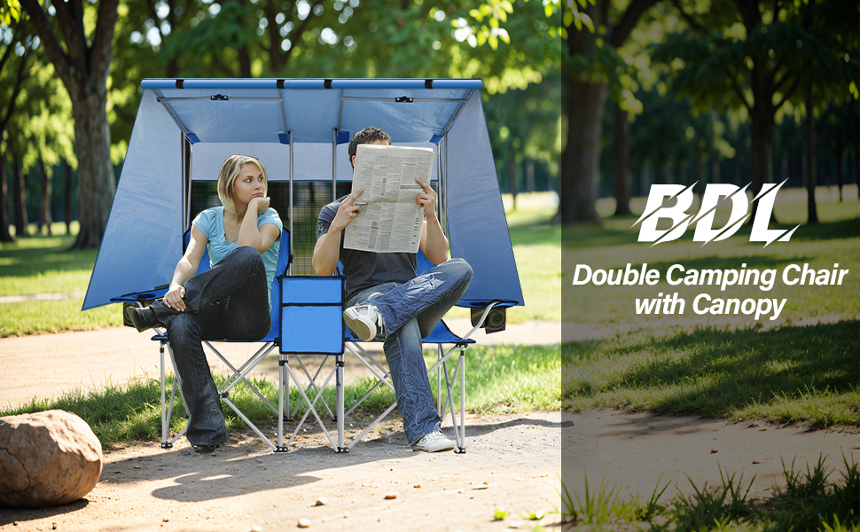 This double folding camping chair with shade canopy is designed for two people, combining comfort, sun protection, and convenience for all outdoor activities. It provides full-coverage shade, stable support, and practical storage features, making it perfect for camping, beach trips, fishing, sports events, and outdoor leisure. The foldable design and included carry bag ensure easy transport and storage.