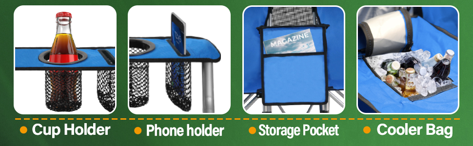 - 🥤 Cooler & Cup Holder: Built-in cooler bag, cup holders & extra pockets for drinks & small items.