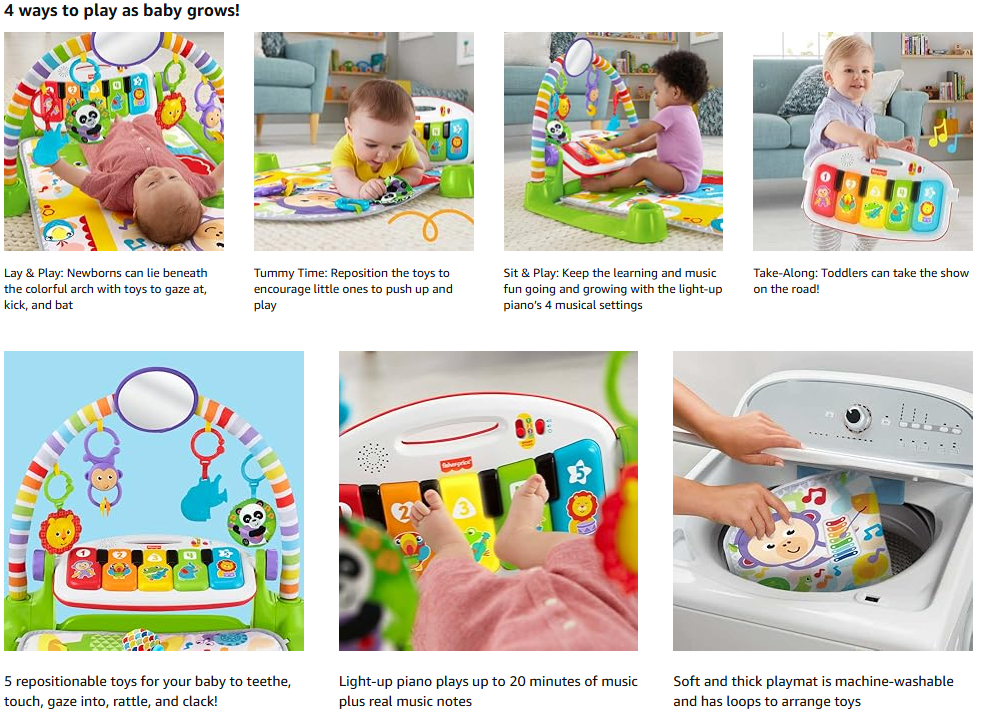 Includes: 1 Large Playmat, 1 Repositionable Toy Arch, 1 Detachable Light-Up Piano Keyboard with Smart Stages, 5 Linkable Baby Toys (Mirror, Teether, Crinkle, Rattle, Clacker), and 2 Soft Rattle Maracas.