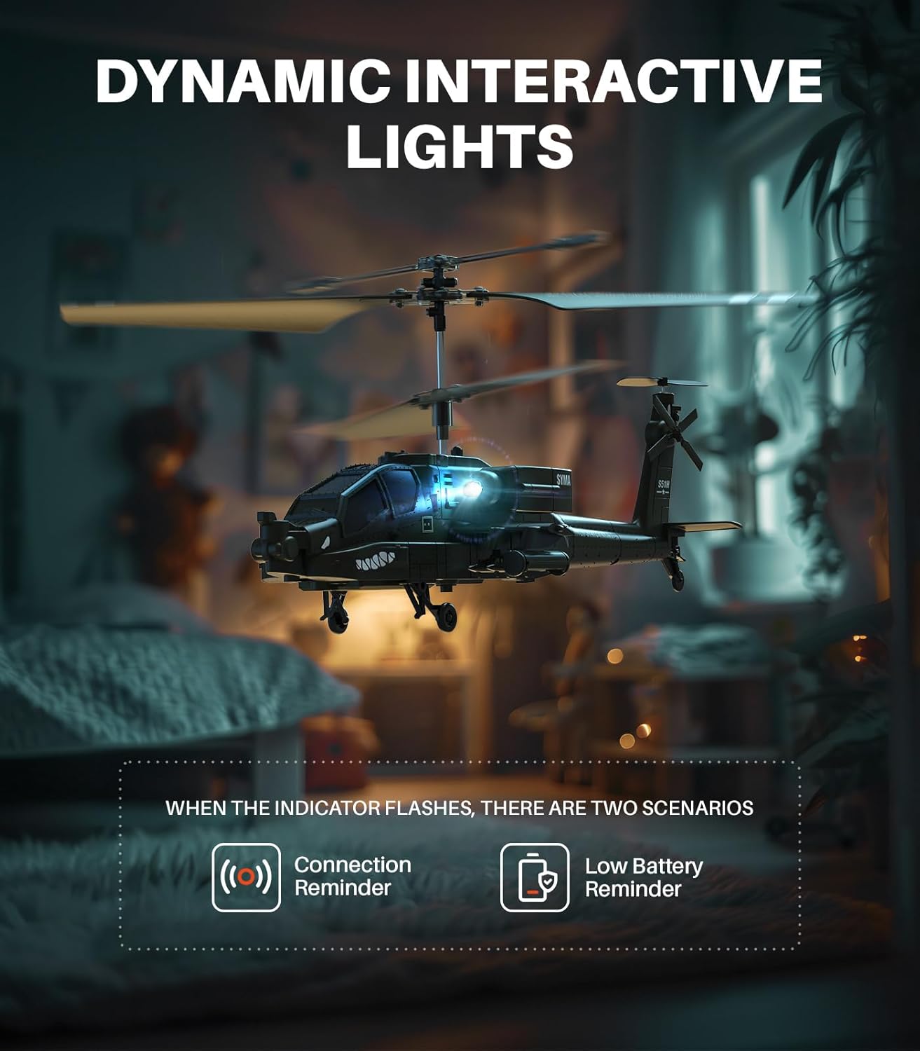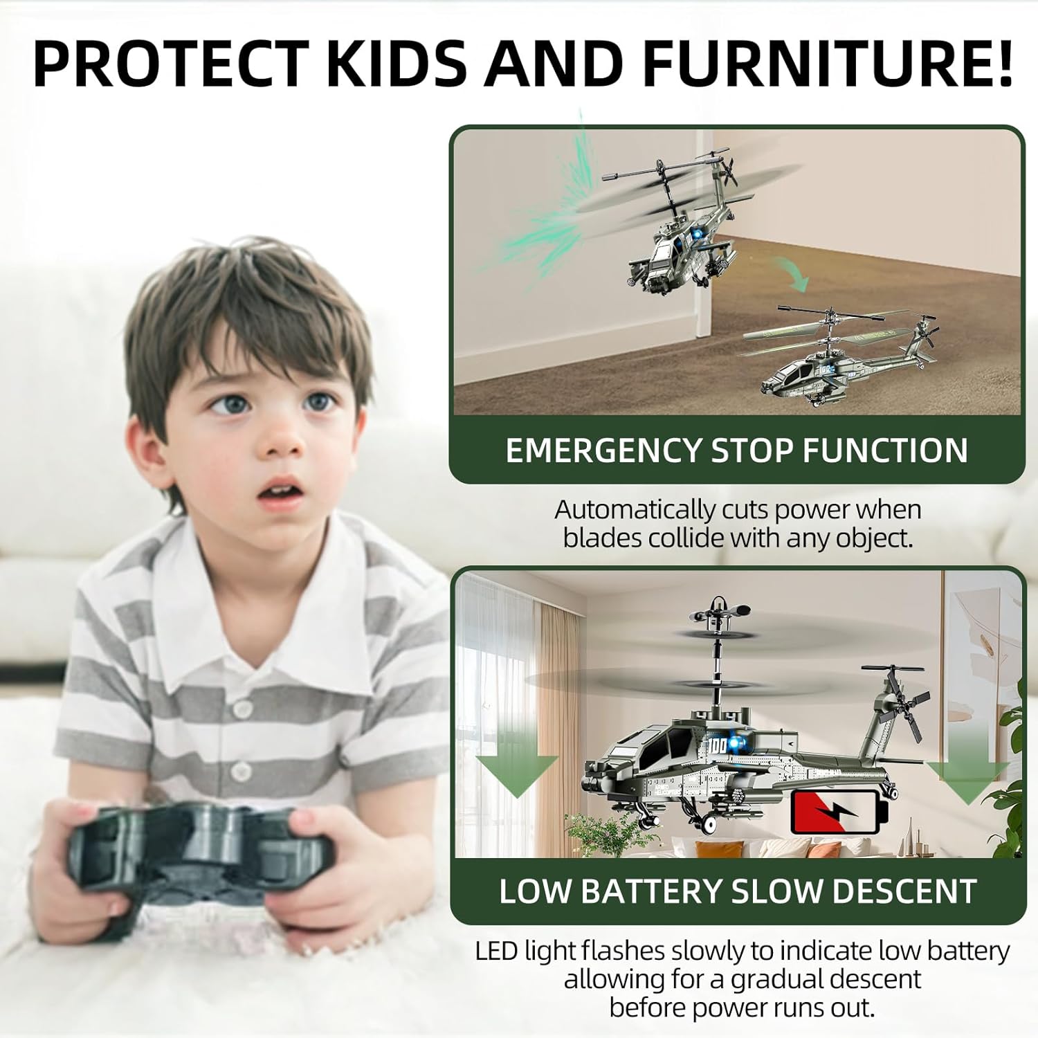 Dual Protection System:If the blades get stuck or blocked during flight, the built-in motor cut-off kicks in to prevent damage. When the battery runs low, the helicopter’s lights flash as a visual reminder to land.